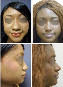 یک دانشجوی پزشکی از کشور آفریقایی غنا می‌خواهد نوک بینی برجسته‌تری داشته باشد و ظاهر بینی‌اش از زاویه‌ی روبرو شکلی باریک‌تر داشته باشد. همچنین در قسمت پشت بینی خود یک قوز کوچک دارد که از وجود آن بسیار ناراضی است. در بررسی بینی او، او ویژگی‌های نامطلوبی را هم از نظر رینوپلاستی شرقی و هم از دید رینوپلاستی غربی مشاهده می‌شود. ویژگی‌های نامطلوب بینی او که با ویژگی‌های نامطلوب بینی‌های شرقی مشترک هستند شامل پوست ضخیم، نوک بینی افتاده و پشت بینی دارای قوز، پره‌های بینی گشاد و نوک بینی بسیار کوچک است. ویژگی‌های نامطلوب در بینی او که با رینوپلاستی غربی مشترک هستند، شامل این موارد می‌شود: قوز در قسمت پشت بینی، پشت بینی استخوانی و پهن، غضروف‌های جانبی تحتانی بزرگ و نوک بینی‌ای که کمی افتاده و یا کج است.